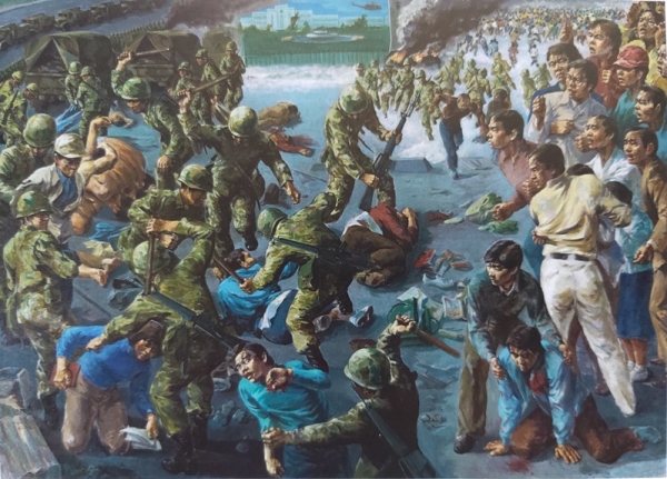 이사범 관련링크 이전글 다음글 목록 본문 약력소개 현실주의 참여미술을 지향해온 화가 이사범은 1949년 광주출생으로 조선대학교 사범대학 미술교육학과를 졸업하였다. 중고교에서 교직 생활을 하면서 화업을 병행해 1982년(광주 아카데미미술관), 2017(‘걸음걸음의 흔적’, 광주시립미술관 금남로분관) 개인전을 가졌다. 단체전은 [오월전](1989~현재, 광주 금남로·오월묘역·갤러리 등), [광주통일미술제]((1995, 1997 광주 오월묘역), [동학100주년기념전](1994, 광주시립민속박물관), [광주민미협 가을 정기전] (2006~?), [노동미술굿](2004, 부산민주공원, 광주 5·18기념문화관 전시실), [걸어온 10년 가야할 10년](2004, 광주시립미술관), [오월전-9개의 창](2005, 광주 5·18기념문화관 전시실), [광주민미협 창립기념-핀치히터](2006, 광주 구 전남도청), [끝나지 않은 전쟁-1987](2007, 광주 구 전남도청), [영호남민족미술인교류전](2007, 광주 5·18기념문화관 전시실), [江강水원래](2009, 광주 5·18기념문화관 전시실), [오월-그 물음에 답하며](2010, 광주 금호갤러리), [신형회전](2011, 광주시립미술관 금남로분관), [그림으로 만나는 오월의 시와 노래](2012, 광주 향토음식박물관 전시실), [신소장품전](2012, 광주시립미술관), [오월-1980년대 광주민중미술전](2013, 광주시립미술관), [최면-의도된 상황](2013, 광주시립미술관 금남로분관), [전남대학교 울란바토르대학 교류전](2013, 울란바토르), [미감-공유](2013, 광주 은암미술관), [소멸-또 다른 시작](2013, 광주 은암미술관), [갑오세 가보세](2014, 광주시립미술관 금남로분관), [충북민족미술·아트페스티벌 ‘인류의 촉각’](2016, 청주예술의전당), [광주미술 어제와 오늘](2015, 광주시립미술관 상록전시관), [천개의 탑](2016, 광주시립미술관 상록전시관), [충북민족미술·아트페스티벌](2016, 청주 우민아트센터), [전국미술인 시국선언전](2016, 광주 비엔날레전시관), [오래된 대장간](2018, 광주 은암미술관), [100인 미술전](2018, 광주시립미술관 금남로분관), [민중畵, 민주花](2020, 광주 은암미술관),[우리가 그곳에 있었다](2020, 광주 오월미술관), [반추된 역사](2020, 광주 은암미술관), [오월미술제](2022, 2024, 광주 은암미술관), [이름없는 전사들](2022, 광주 BHC갤러리), [10·26 탕탕전](2023, 광주 BHC갤러리), [서양화 유명작가 23인 초대전](2024, 광주 수하갤러리), [청류탁세](2024, 광주 국립아시아문화전당 전시실) 등에 참여했다. 광주전남미술인공동체 회장과 광주민예총 부회장으로 일했고, 전남대학교 미술학과 외래강사였으며, 광주민미협과 신형회 회원, 광주미술상운영위원회 운영위원으로 창작활동 중이다. 작가의 작품세계 “이사범의 그림 주제는 크게 세가지로 나눠볼 수 있다. 먼저 ‘시장 사람들’이다. 그의 시장 풍경은 주로 시골 5일장 풍경인데, 막걸리와 국밥을 들고 있는 시골 할머니 할아버지의 모습을 통해 훈훈한 정과 사람 사는 냄새를 깊이 느낄 수 있다. (중략) 시장은 작가에게 사람 냄새 물씬 풍기는 장소이자 어머니에 대한 깊은 그리움이 배어 있는 곳이기도 하다. 두 번째로는 ‘시대 상황의 표현’이다. 작품 <아들의 낫을 가는 아버지>(1989), <공수부대의 만행>(1990), <쌀>(1993), <그날>(1996), <강을 손 본단다>(2009), <잃어버린 것들>(2009), <새 며느리의 밥상>(2013), <최면>(2013), <거울아 거울아>(2015), <왜>(2015) 등은 광주민중항쟁의 참상과 우리네 밥상이 서양음식으로 대체되고 있는 상황, 피폐화되어가고 있는 농촌, 이명박 정권의 4대강 사업, 그리고 세월호 참사까지도 사실적이면서도 상징적으로 보여주고 있다. 마지막으로는 첫 번째와 두 번째 주제가 공통분모처럼 겹쳐지는 ‘농어촌 사람들’을 표현한 것이다. 일을 하고 밝게 웃는 인물상도 보이지만 전체적인 느낌은 깊은 고독감과 외로움이다.” - 임종영 (광주시립미술관 학예연구사), 2017 개인전 팸플릿 평문 중 연락처 광주광역시 북구 서암대로30번길 10-6 010-4601-9347 24beum@hanmail.net 이사범 <아들의 낫을 가는 아버지>, 1989, 캔버스에 아크릴, 162x130cm이사범 <공수부대 만행>, 1996, 캔버스에 유채, 180x250cm이사범 <지상에 깃대를 세워>, 1997, 혼합재 설치이사범 <마음의 정>, 2004, 캔버스에 유채, 60F이사범 <쌀-지킬 땅, 숨결>, 2006, 캔버스에 유채이사범 <묘역에 봄은 오는가>, 2012, 캔버스에 유채이사범 <침탈된 밥상>, 2014, 캔버스에 유채, 60호P이사범 <빨간색으로>, 2020, 캔버스에 유채, 아크릭, 227.3x145.2cm9.이사범 <주먹밥 (밥이 하늘이요 꽃이다)>, 2024, 캔버스에 유채 댓글목록 등록된 댓글이 없습니다. 이전글 다음글 목록