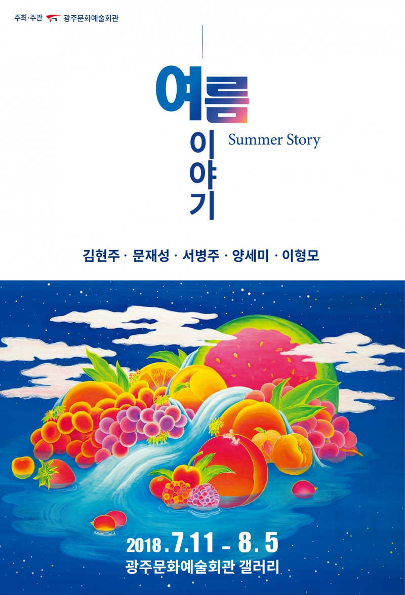 광주문화예술회관 기획전 '여름 이야기' 페이지 정보 작성자 광주문화예술회관 작성일18-07-09 11:35 조회5,133회 댓글0건 관련링크 이전글 다음글 수정 삭제 목록 본문 '여름 이야기' 뜨거운 태양이 작열하는 7월, 광주문화예술회관에서는 무더운 여름을 시원하게 이겨낼 수 있는 『여름 이야기』 전을 마련한다. 이번 전시는 바쁜 일상에 지쳐 달콤한 휴식을 꿈꾸는 관람객들에게 각기 다른 개성을 지닌 김현주, 문재성, 서병주, 양세미, 이형모 등 5인의 작가가 ‘여름’이라는 공통 주제로 색다른 여름휴가를 제시한다. 푸른 바다, 서늘한 밤바람, 탐스러운 과일 등 여름이 연상되는 작품들로 구성된 이번 전시는 관람객을 여유와 설렘이 가득한 바캉스로 인도하여 일상에서의 일탈과 즐거움을 선사하고자 한다. 누구에게나 찾아오는 여름이지만 그 의미와 경험은 모두 제각각이기에 5명의 작가는 각자의 시선으로 바라본 여름의 모습을 다양한 작품들로 선보인다. 이들의 작품을 통해 한여름의 더위를, 현실의 무게를 잠시나마 잊을 수 있기를 바란다. 1. 전 시 명 : 여름 이야기 2. 전시기간 : 2018. 7. 11(수) - 8. 5(일) 3. 전시장소 : 광주문화예술회관 갤러리 (대극장 內) 4. 전시작품 : 회화작품 34점 5. 참여작가 : 김현주, 문재성, 서병주, 양세미, 이형모 댓글목록 등록된 댓글이 없습니다. 이전글 다음글 수정 삭제 목록