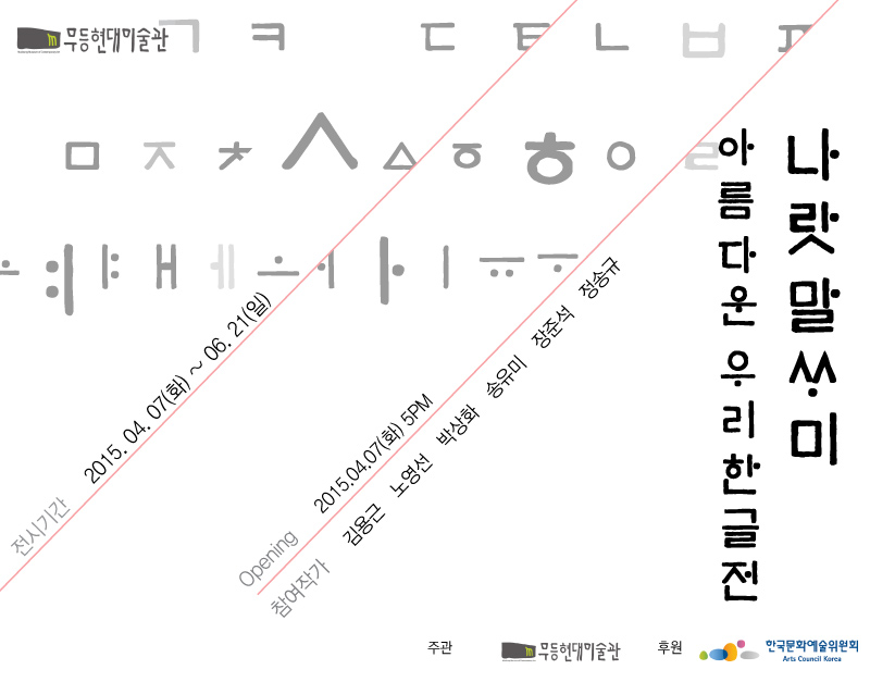 나랏말싸미, 아름다운 우리 한글전 페이지 정보 작성자 무등현대미술관 작성일15-04-08 13:32 조회7,057회 댓글0건 관련링크 이전글 다음글 목록 본문 2015 나랏말싸미, 아름다운 우리 한글전 ◾전시명 2015 나랏말싸미, 아름다운 우리 한글전 ◾일 정 2015. 4. 7(화) ~ 6. 21(일) ◾참여작가 김용근, 노영선, 박상화, 송유미, 장준석, 정송규 ◾주 관 무등현대미술관 <?xml:namespace prefix = "o" ns = "urn:schemas-microsoft-com:office:office" /> 무등현대미술관(관장 정송규)은 유네스코 세계 기록 유산으로 지정된 훈민정음을 창제하신 세종대왕의 위대한 업적을 기리고, 한글의 우수성과 과학성을 너무 당연시하고 인식하지 못했던 가치와 소중함을 일깨우고자 <나랐말ᄊᆞ미, 아름다운 우리 한글> 전시를 오는 4월 7일 부터 6월 21일 까지 개최한다. ‘훈민정음(訓民正音) : 백성을 가르치는 바른 소리 글자’이라는 이름으로 창제된 한글은 세종대왕이 백성들의 문자 생활의 불편함을 딱하게 여겨 만든 애민 정신(愛民精神)의 산물이다. 28개의 자모음으로 이루어진 한글은 5백여 년 전에 만들어졌지만 현대 언어학의 관점에서 보아도 손색이 없는 훌륭한 제작 원리를 갖추고 있으며, 당시의 성리학적 세계관도 부합하여 심오한 철학을 담고 있다. 시간과 공간을 뛰어넘어 수백 년 전의 말을 전하기도 하고, 수백 킬로미터 떨어진 곳에 말을 전하기도 하는 한글의 고유한 기능은 더 나아가 예술의 소재가 되어 문자라는 고유한 틀에서 벗어나 다양한 변신을 보여주고 있다. 한글이 담고 있는 언어적인 내용뿐만 아니라 한글자체가 지닌 미적ㆍ조형적 가치에 세계인의 관심이 쏠리고 있다. 이번 전시는‘한글’을 바라보는 특유의 관점을 담아 독특한 분위기를 내면서 다채로운 모습들로 표현한 예술 작품들을 선보이고자 한다. 김용근은 한글 창제의 기본 바탕이 되는 ‘ㄱ, ㄴ, ㅁ, ㅅ, ㅇ’글자에 획이나 점을 더하여 다양한 형제 글자를 만들었던 것처럼 기본색 6색으로 병치혼합을 통해 총 천연색으로 완성한 작품‘낯섦 기호 소멸’, ‘문자의 권력’, ‘문자, 수화 그리고 점자의 소통’이라는 주제로 드러내고 있다. 작품 속 문자를 소통의 기호로써 세상 밖 대상인식과 자기 안의 내면인식을 연결시키는 끈으로 제시한다. 문자는 파생적으로 듣고, 쓰고, 말하는 언어 행위인 동시에 또 다른 형태(수화, 점자)로 전환되는 소통의 도구이자 시대와 문화의 산물에 의해 진화와 퇴화, 생성과 소멸되어 가는 문자에 대해 지속시키거나 타 문자를 소멸시키는 문자의 권력이 존재한다고 본다. 노영선은 한글의 자모음을 그대로 보여주는 작업에서 시작하여 한글의 자모음을 변형하고, 늘리고, 자유롭게 배치한다. 그 위에 동양철학의 음양오행을 접목시키고 오방색의 병치와 중첩을 통해 한국적 정서가 깊이 배어 있는 아름다운 우리 문화유산과 한글의 미적․조형적 가치를 드러내고자 한다. 송유미는 한글이 창제되었던 조선시대 여성의 삶에 대해 그들의 이야기를 삽입하여 과거를 번역하고 새로운 문맥으로 만들어내는 풍경을 제시하고 있다. 조선시대 유교적인 현실에서 아무것도 할 수 없었던 규방 여성들의 삶의 애환을 시로, 가사로 한 글자 한 글자 쓰고 캔바스 위에 덧칠하는 꼴라주를 통해 마음 속 맺힌 한(恨)을 한글을 통해 표출하고 소통하는 창으로 담아내었다. 장준석은 소리를 닮은 글자 한글의 무한한 상상의 여지를 넓히며 새로운 추상으로 이끄는 조형적 언어로 재구성한다. ‘꽃’이라는 글자가 갖는 본래의 의미에서 한 단계 멀어진 기호화된 ‘꽃’을 형상화하여 살아있는 꽃은 인공적인 고무와 폴리로 만들어지고 거기에 입혀진 색은 다시 생명력을 전하며 역설의 역설을 반복한다. 도식화된 문자의 본래 의미가 감성적인 단어와 충돌하여 새로운 상황으로 연출되면서 작가는 이성적 통념을 벗어나 보는 즐거움 그 자체의 순수함과 맑은 사색의 기회를 부여하고자한다. 박상화는 한글의 단어와 문장들을 사용하여 숲을 재현한 언어의 풍경을 보여준다. 언어의 숲은 일상에 지친 현대인들의 마음을 위로하고 텅 빈 마음의 여백을 채워줄 자연의 풍경들과 조우하며 그 안에서 동화해가는 인생의 여정을 그려내고자 하였다. 또한 관객 스스로가 작품의 일부가 되는 공간과 대상의 자연스러운 소통과 교감을 이끌어 낸다. 숲으로 재현된 언어의 풍경은 쉼의 장소이자 사유의 공간이며 영원의 안식과 치유의 순간을 제공하기에 충분할 것이다. 정송규는 유네스코 세계 기록 유산으로 지정된 훈민정음을 창제하신 세종대왕의 위대한 업적을 기리고, 한글의 우수성이 세계적임을 잘 알 고 있으면서도 외래어의 홍수 속에서 한글을 소홀히 하고 잊혀지는 요즈음의 세태를 되돌아보게끔 한다. 이번 전시를 통해 우리가 매일 만나고, 숨 쉬는 것만큼 익숙해진 그 소중함을 잊고 살아가는 아름다운 우리 글 ‘한글’을 재인식하고, 다양한 형식으로 탐구하고 새로운 표현 방식으로 확장을 시도하는 전시를 통해 한글의 아름다운 가치를 재조명하는 계기로 삼고자 한다. 댓글목록 등록된 댓글이 없습니다. 이전글 다음글 목록
