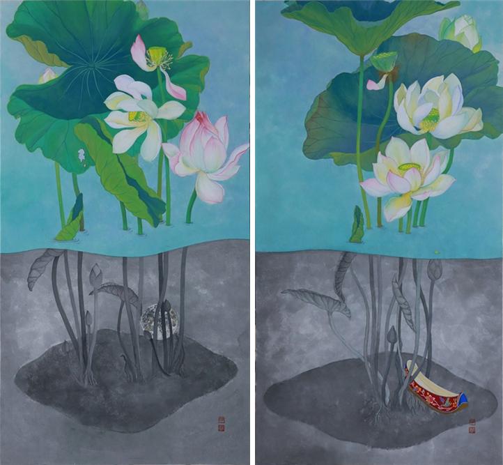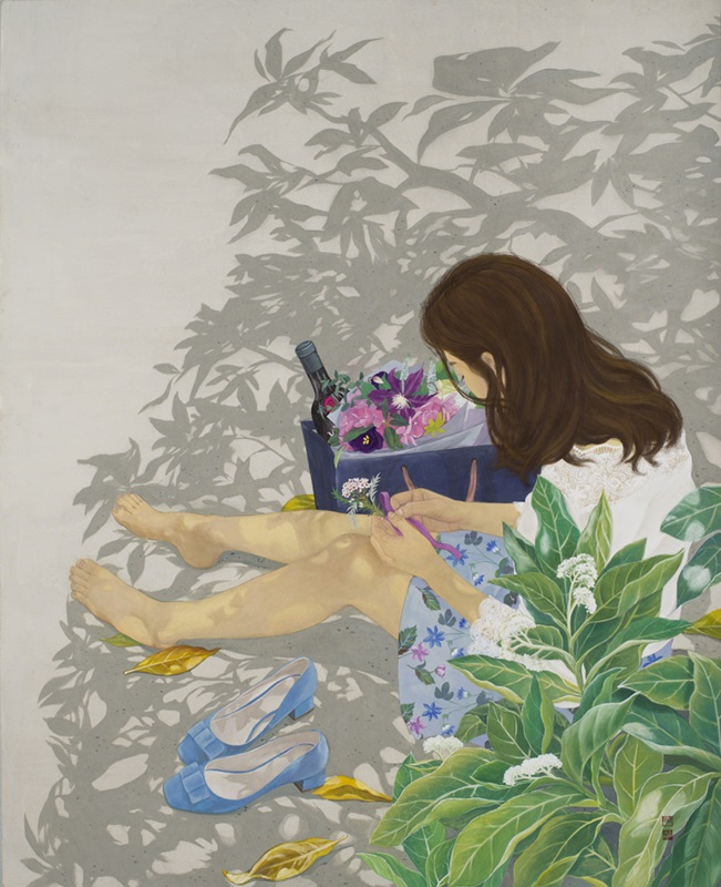 꿈과 기억의 향기; 이선희 '夢中香' 展 페이지 정보 작성자 광주미연 작성일17-10-14 17:23 조회7,421회 댓글0건 관련링크 이전글 다음글 목록 본문 이선희. <나무그늘 아래>.2016. 마직에 분채. 130×162cm 꿈과 기억의 향기; 이선희 ‘夢中香’展 2017. 10.11-10.24 김냇과갤러리 산다는 게 꿈과 꿈 사이를 오가는 일일 수도 있다. 욕구와 희망으로 그려가는 현실세계의 꿈과, 그 현실의 의식활동 이면에서 부지불식간 경험하게 되는 전혀 생소한 꿈의 세계가 서로 이어진 듯 다른 듯 삶을 엮어 가기 때문이다. 무의식에 잠재된 또 다른 나의 정신세계에서 새삼스레 현실의 나를 깨닫거나, 현실 너머의 상상과 바램들로 꿈인 듯 잔상인 듯 내 삶의 화폭들을 채워가는 것이다. 사는 중에 간혹 들춰지는 기억들은 의식과 무의식에 녹아들어 문득 지금의 거울로 비쳐지는 나의 내면들이다. 한때 실재했던 사실로서 기억이지만 시간의 퇴적에 따라 추억과 향수라는 감성적인 여운으로 지금의 나를 물들게 하거나 다시 곧추세우는 심지가 되기도 한다. 의식활동으로서 기억과, 감성적인 삶의 반향으로서 추억과 향수는 현실의 꿈과 내면의 꿈과도 같은 이면성과 연계성을 갖고 있는 셈이다. 이선희의 작업에서 기억과 향수와 꿈은 주된 화제꺼리들이다. 과거의 기억들이 삭혀지고 발아되어 추억과 향수가 되기도 하고, 예쁜 꽃단장으로 되살아나거나 여전히 아픈 상처의 흔적으로 남아있기도 하다. 초기부터 보여 온 꿈속인 듯 자기정화 중인 듯 살빛이 비칠 듯 말 듯한 시스룩의 여인 연작도, 꽃송이를 꽂은 살랑이는 머릿결의 목덜미나 하늘빛 머금은 엷은 스커트 자락, 맑은 순수를 담은 여인의 뒤태나 표정이 가려진 뒷모습들도 그런 이선희 작업의 성향들을 보여주는 주된 이미지들이다. 상실을 딛고 다시 피어나는 꽃과 같은 인생, 닿을 수 없는 그날을 그리움과 향기로 추억해내는 연작들이다. 이선희의 회화는 대부분 사실성 위주 세필묘법으로 일상 소재의 친근감을 주지만 거기에 추억과 향수와 꿈이 더해지면서 현실인 듯 몽환인 듯 불확실한 시공간으로 이끌어 간다. 그것은 꿈의 세계가 시점도 장소도 공간도 모호한 채 뒤섞이면서 전혀 생각지도 못한 일들이 펼쳐지는 것과 같은 맥락이다. 현실에서 마주했을 법한 익숙한 인물 모습과 사실적인 묘사를 통로 삼아 서정과 상상이 결합된 몽환의 세계로 이끌어가는 것이다. 어느 때 어느 순간의 기억들을 사실과 아련함을 섞어 몽환적인 세계로 드러내면서 거기에 상상을 유도하는 스토리를 더하는 방식이다. 그가 이번 전시를 준비하면서 “그동안의 작업이 대체로 사실적인 묘사 위주였다면 그 명료한 것들의 틀에서 벗어나고 싶다.”고 했지만 여전히 작업은 명료한 사실화법을 기초로 어렴풋한 상상을 불러일으킨다. 그의 그림의 주된 소재인 제각기 다른 색깔과 자태와 향기를 지닌 꽃들이 감성을 자극하는 여인의 모습들과 함께 거의 모든 작품에 담겨지면서 단지 탐미적 관점이나 화면 장식효과로서가 아닌 작품에 담긴 이야기를 유추하는 단서가 되고 있다. <꽃 속으로 숨다>는 능소화 그늘 속에 눈을 가리고 있는 여인의 모습이다. 꽃그늘 아래 수줍은 소녀처럼 보여지는 이 작품은 최근 가까운 지인에게서 경험했던 이중적 태도와 그로 인한 마음의 상처, 스스로를 눈멀게 할 수 있는 그녀의 자기기만에 대한 연민이 담겨 있다. <그리움>의 경우에도 마음에 남은 지난날의 성장기 상처를 시골 울타리집을 연상시키는 하얀 탱자꽃 가시덩굴로 반추시키면서 그 또한 추억이라 여기는 지금의 모습에 스스로 가시면류관을 씌워 위무하는 것이다. 이선희. <헛된 시간이 없는 것처럼>. 2017. 마직에 분채. 각74x138cm 두 점으로 제작된 <헛된 시간이 없는 것처럼> 연작은 일반적인 연꽃그림들과는 달리 연꽃의 뿌리부터 꽃과 잎까지 수면 위·아래 색채를 달리해서 전체 모습을 함께 그려낸 구성에서 눈길을 끈다. 이전에는 물 밖으로 드러난 화려한 연꽃과 연잎 위주의 묘사들이었다면, 진흙탕 사바세계에 뿌리내리고 꿋꿋이 뻗어 오른 연줄기 부분을 흑백으로 묘사하고, 수면 위로 펼쳐진 푸른 잎과 화사한 꽃송이들을 원색으로 묘사하여 대조시켰다. 뿌리와 줄기, 꽃과 잎과 열매가 동시에 생장하며 한꺼번에 보여주는 연꽃의 일생을 사람의 생애와 같다고 본 것이다. 한 생명의 드러나지 않은 내면과 현상으로 나타나는 현재, 이 생 다음에 이어질 다음 생의 예비를 함께 보여주는 것이다. <씨앗으로 날리다>는 하얀 소복의 전통 살풀이 춤사위에 민들레 홀씨들을 흩날리듯 그려 넣었다. 망자에 대한 애도·해원과 함께 그 죽음 이후로 이어지는 새 생명의 시작을 함께 보여주는 작품이다. ‘무당춤’ 연작에서도 뚝뚝 떨어진 섬붉은 동백꽃을 통해 삶과 죽음의 찰나성, 동시성을 표현하기도 한다. 이선희는 최근 그동안 인물 일변도로 이야기를 풀어내는데 한계를 느낀다고 한다. 자유자재한 전신 포즈들이나 표정으로 속내를 내밀하게 보여주기보다 여체의 일부나 뒷모습, 꽃과 함께 이루어내는 분위기들로 화면을 꾸려내기 때문이다. 따라서 화폭의 배경이면서 상상을 보다 풍부하게 펼쳐