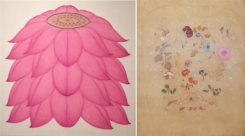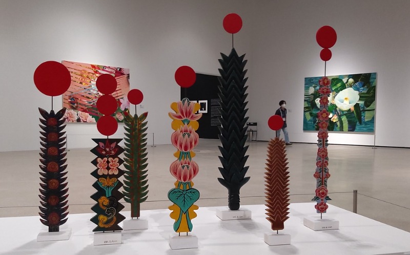 환희와 축원의 ‘영원‧낭만‧꽃’ 페이지 정보 작성자 조인호 작성일23-09-15 13:55 조회5,673회 댓글0건 관련링크 이전글 다음글 목록 본문 손봉채 <꽃들의 전쟁>, 2022, 폴리카보네이트에 유채, 120x90cm 환희와 축원의 ‘영원‧낭만‧꽃’ 2023.06.20-11.05. / 전남도립미술관 전남도립미술관 기획전 ‘영원, 낭만, 꽃’ 전시에는 여러 비유가 깔려 있다. “삶은 계속해서 변하는 것이고, 그 변화에 매몰되지 않고자 하는” 통찰의 시각을 다양한 꽃 소재 작품들로 살펴보는 전시다. 오감의 대상으로서보다는 상징과 감성의 또 다른 차원으로 꽃 작품들을 펼쳐놓았다. 동서고금을 넘나드는 여러 유형의 작품들은 인생만큼이나 폭도 층위도 복합적이다. 다섯 섹션으로 나눈 전시구성 중 첫 번째 ‘연화화생(蓮華化生), 재생의 염원’에서는 해남 대흥사 소장 <준제관음보살도> <천수천안관음보살도> 한 쌍이 먼저 눈에 들어온다. 초의선사가 그린 것으로 전해지는 19세기의 것이면서 연화대좌 위 입상과 좌상의 관음보살도 광배에 화염문 대신 장식해 넣은 꽃그림 구성이 일반적인 불화와는 다른 독특한 양식을 보여준다. 이와 함께 서로 마주 배치한 고려청자와 조선 청화백자도 전통 문양에서 기품 있는 꽃도상 장식의 예를 잘 보여준다. 참외모양 청자 주전자와 받침접시에 음각으로 꽃무늬를 새겨넣은 음영효과가 은은하고, 날렵한 백자주병(白磁酒甁) 몸통 사방에 연화당초문과 박쥐문을 그려 넣은 청화그림 또한 화려하면서도 정갈하다. <백자 청화연화당초문 수명병>(조선, 19세기) / <자수 꽃무늬보자기>(19세기말~20세기 전반) 두 번째 섹션 ‘자유와 역동, 구체적 삶의 복귀’는 주로 한국의 민속 자수공예품과 서양 태피스트리들로 구성되었다. 한땀 한땀 정성들여 꽃무늬를 수놓은 어린이용 분홍 가죽신발이나, 연꽃무늬 화조 자수와 축원의 금박글자를 넣은 자주빛 복주머니는 장식과 실용을 넘어선 영원한 강복(康福)의 염원이 담겨있다. 또한 꽃과 나비 자수로 한가득 장식한 보자기나, 서양자수의 영향이 보이는 6폭 병풍의 화조 자수에도 안녕과 만복을 바라는 민속공예의 장인 솜씨와 신심이 깃들어져 있다. 아울러 이들과 함께 전시된 유럽 태피스트리들도 프랑스 돔 로베르(Dom Robert)의 <수천 개의 들꽃>처럼 성직자임에도 종교적 도상보다는 화면 가득 꽃과 조류들을 채워 넣거나, 가스통 두앵(Gaston Douin)의 원작을 태피스트리로 옮긴 <앵무새들>처럼 동양 화조도의 형식을 띤 화면 양식에서 동서양 다를 것 없는 장식효과 이상의 부귀영화 기원의 마음을 읽을 수 있다. 세 번째 섹션 ‘시대를 넘어’에서 17세기 바로크 시대 프랑스 궁정화가였던 샤를 르 브룅(Charels Le Brun)의 <사계>는 베르사이유궁 권좌의 주인이었던 루이 14세의 위엄을 치장하기 위해 제작된 금실직조 태피스트리다. 전쟁의 신이자 농업의 수호신인 마르스(Mars)와 꽃과 봄의 여신 플로라(Flora)를 중앙에 마주하게 배치하고 농기구와 방어용 무기를 하단에 두면서 온갖 꽃과 화병들로 장식해 넣어 왕권의 신성과 평화로운 치세를 과시하고 있다. 이와 달리 20세기 초에 제작된 클로드 모네(Claud Monet)의 <수련> 태피스트리는 화사한 햇살 아래 만발한 연꽃들의 감각적 아름다운 풍경을 직물로 옮겨 놓았다. 르동(Odilon Redon)의 의자 등받이용 직조도 배경이 생략된 채 허공에 흩뿌려진 듯한 꽃잎들로 작가 특유의 환상적 분위기를 풍긴다. 한편으로 이 섹션에 함께 한 한국 작품들도 몽환적 세계를 보여준다. 천경자의 <화혼>은 화려한 꽃무리지만 은연중에 우수와 초월적 심상이 배어나고, 오승우의 <요정과 연꽃>은 ‘불상’과 ‘동양의 원형’ 연작 사이 잠시 심취했던 설화적 환상경을 모호한 형상으로 풀어놓았다. 김홍주의 <무제> 연작은 채색화와도 같은 정교한 연꽃잎들의 묘사이면서도 그 관점을 여러 각도로 달리하면서 종교적 경건함을 담아낸다. 김홍주 <무제>, 1996, 캔버스에 아크릴릭, 184.3x184.3cm / 오딜롱 르동 <손잡이가 있는 의자등받이를 위한 그림>, 1911, 캔버스에 유채, 91x72cm. 어두운 암실에 대형 미디어아트 스크린 영상이 투사되는 네 번째 섹션 ‘미래로부터’는 미국 제니퍼 스타인캠프(Jennifer Steimkamp)의 <미래로부터>를 위한 공간이다. 검은 바탕에 잔잔히 흔들리는 꽃들의 구성과 색채가 자개장식 꽃그림을 연상시키는 3D 애니메이션이다. 고요한 흔들림만이 계속되다 보니 외려 무슨 일이 일어날지 모르는 불안감이 들기도 하는데, 꽃들 외에 다른 아무것도 곁들이지 않은 간결하면서 화려한 화면이 자연생태 초원 이상의 처연한 신비감을 자아내기도 한다. Jennifer Steincamp의 미디어아트 영상 <미래로부터> 마지막 다섯 번째 섹션은 ‘삶의 확장, 가능성을 향해’다. 손봉채의 <꽃들의 전쟁> 연작은 투명 폴리카보네이트에 유화물감으로 그린 꽃그림을 몇 겹씩 중첩시키고 LED 조명을 넣어 홀로그램 같은 깊이감을 냈다. 언뜻 화려해 보이는 화병들이지만 실재처럼 세밀하게 묘사된 각각의 국화(國花)들은 치열한 무역전쟁과 군사대립과 이권 다툼을 벌이고 있는 국제 관계 현실을 풍자하고 있다. 구성연의 ‘사탕’ 연작도 기묘한 실재감과 공허감