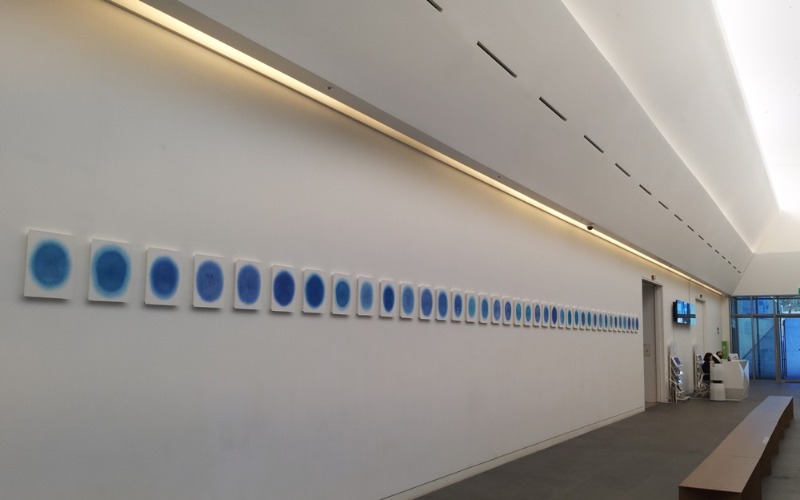 섬을 품은 한 획 ‘파랑’ ; 강운 개인전 페이지 정보 작성자 조인호 작성일23-03-21 13:50 조회5,454회 댓글0건 관련링크 이전글 다음글 목록 본문 강운 개인전이 열리고 있는 장도전시관 섬을 품은 한 획 ‘파랑’ ; 강운 개인전 2023.2.24-3.30 / 여수 예울마루 전도전시관 섬에서 섬을 품은 한 호흡의 일획을 그었다. 그리고 세상살이 중의 이런저런 독백과 성찰과 상념을 두터운 물감면에 쓰고 칠하고 또 쓰며 마음산책을 화폭에 올렸다. 강운의 섬작업 반년을 담은 개인전이 여수 예울마루 장도도서관에서 ‘파랑’이라는 이름으로 2월 24일부터 3월 26일까지 열리고 있다. 예술섬 장도 레지던시 입주작가 전시회다. 지난해 9월 초에 들어와 3월 말에 섬 생활을 마감하기 전 그동안 반년의 또다른 세계에서의 성찰과 작업을 내보이는 전시다. 예울마루 앞 큰길 건너편 입구에서 진섬다리로 200여m 거리지만 그래도 바다는 바다인지라 물이 들고나는 때를 맞춰 오가야 하니 섬은 섬이다. 제법 드센 바닷바람 가르며 섬으로 건너가면 작은 어선들이 몇 척 매어져 있는 선창가에 하얀 레지던시 집들이 몇 동 있고, 더 깊숙이 섬 안으로 들어가면 장도전시관에 이르는데, 그 산책길 사이사이 나즈막한 언덕에는 매화며 복사꽃이며 화창한 봄날이 더없이 화사하다. 섬 경사면에 자리한 장도전시관은 한쪽 입구는 약간 비탈지게 지하로 들어가고, 반대쪽은 솔숲과 바다 풍경과 함께하는 1층의 구조다. 전시실 안 한쪽에 통창을 내어 장도의 솔숲과 하늘이 내다보이게 해서 시야를 터주면서 자연채광과 전시조명이 어우러져 작품 색감들이 더 제 색을 낸다. 한쪽 벽에는 파랑, 다른 벽에는 노랑으로 여수의 무인도와 유인도 360여 섬들을 품은 600여 점의 ‘일획’ 연작을 줄 맞춰 배치했다. 지도에서 따낸 각각의 섬 모양들을 스티커로 만들어 바닥에 깔고 그 위 물기 촉촉한 종이에 한 호흡으로 그은 획들이 노랑과 파랑의 섬 연작으로 펼쳐져 있다. 한 획을 긋는 그 시점의 습도와 온도, 종이의 습한 정도, 붓의 속도에 따라 그어지는 획의 기운이나 번짐, 우연찮게 만들어지는 기포의 모양들이 다 달라진다고 한다. 그러다 보니 언뜻 같은 색깔의 일획 반복작업들로 보이지만 하나하나가 획의 색감이나 농도, 번지고 스민 현상들이 제각기 달라 보인다. 획을 긋는 건 작가의 의지이고 심신의 상태이자 행위지만 그 짧은 순간 작용하는 외부 환경과 자연조건들이 결합되어 작가 자신도 알 수 없는 결과들로 나타나게 된다. 그 한 점 한 점과 마주하는 이도 호흡을 가다듬고 차분히 교감하다 보면 비정형의 추상회화 같은 한 획 안에서 오묘한 색채변화의 파랑 또는 노랑에 잠기듯 희미하게 드러나는 섬의 실루엣들을 느끼게 된다. 무인도는 파랑, 유인도는 노랑이라는데, 현상적 시각효과로 설정된 색채가 아닌 그의 오랜 삶의 축적과 기억과 경험과 상념들에 따라 마음에서 떠오른 심상의 색이다. 강운의 ‘일획’ 연작이 한순간을 응축시켜낸 심신상태의 행위적 흔적이자 그 획을 둘러싼 기의 파동과의 결합이라면, ‘마음산책’은 긴 시간 내면에서 일렁이거나 시시때때로 일어나는 질문 답변과 독백, 성찰, 자기치유의 축적들이다. 일상 가운데 무시로 일어나는 아픈 기억과 우울감, 상념, 혼란스러운 심적 상태, 자기 위로와 깨우침이 하나하나 층위를 이루며 두텁고 거친 화폭들로 외화된 것들이다. 삶 속에서 느껴지는 무수한 번뇌와 웅얼거림과 자기극복 의지와 길 찾기들이 일기처럼 문장을 이루고, 그런 숱한 얘기들이 색층을 달리하고 방향을 바꿔가며 서술되다가 또 다른 색과 독백이 얹히다 보면 화면에는 읽을 수 없는, 읽히지 않는 수많은 삶의 단편들이 축적되게 되는 것이다. 그러다 보니 미리 상징화시켜 설정할 수 없는 그때그때 심상의 색들이 덧쌓이고 드러날 듯 말듯 생채기를 품은 거친 등걸 같은 화면으로 우러나게 된다. 그 화폭들은 수없이 덧쌓여진 서사적 속내와 상관없이 각기 다른 화폭들로 만나 옆으로 또는 위아래로 배치되어 넓은 심상풍경을 펼쳐낸다. 전시장 한쪽 벽면에 사이사이 쉼의 공간들과 함께 배치된 이들 ‘마음산책’은 거칠면서도 잔잔하게, 때론 격하면서도 차분하게 마음의 대화를 청한다. 그가 섬에서 담아낸 ‘일획’들은 실제 작업현장에서 더 생생하다. 장도 선창가 옛 어민들의 집터에 들어선 아담한 레지던시 스튜디오는 창밖 바다풍경과 그 건너 분주한 해안가 도시풍경과 섞이어 삶과 일정 거리를 두고 이어지기도, 떨어져 있기도 하다. 아담한 작업실 바닥에는 아직 마르지 않는 ‘일획’ 작업들이 줄지어져 있고, 각 획들 아래에는 그 안에 품은 섬의 이름들이 메모되어 있다. 숨을 담는다는 관념적 접근이 아닌 것은 한쪽 창에 정리되어 붙여진 여수의 유인도 무인도의 축소된 모양들과 이름들의 도표로 인정하게 된다. 합판을 올려 만든 임시 작업테이블에는 작업의 흔적이 담긴 푸른 물통과 넓직한 붓들이 휴식 중이다. 비록 현실공간과 지척에 있는 작은 섬이지만 이 섬에 들어와 있던 반년 동안 그는 참으로 귀한 시간을 가졌다 한다. 일상 밖 다른 공간에 옮겨진 자신을 객관화시켜보고, 